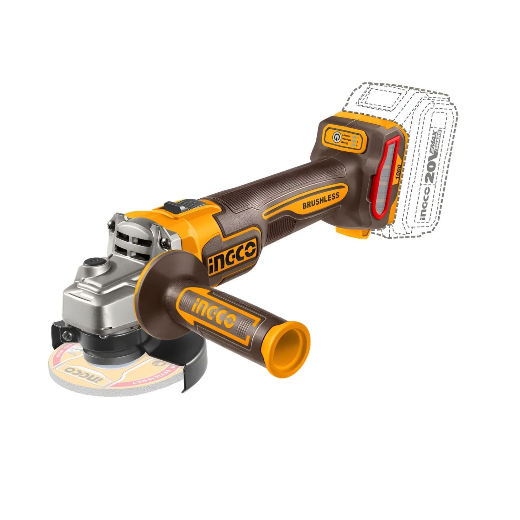 ATENÇÃO: Bateria, carregador e disco não estão inclusos. Ferramenta compatível com o sistema de baterias 20V P20S da Ingco.
